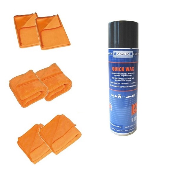 2 chiffons Soft 60x40 cm + 2 chiffons Polish Double 40x40 cm + 2 chiffons multifonction 50x40 cm + 1 aérosol nettoyant lustrant à sec 500ml