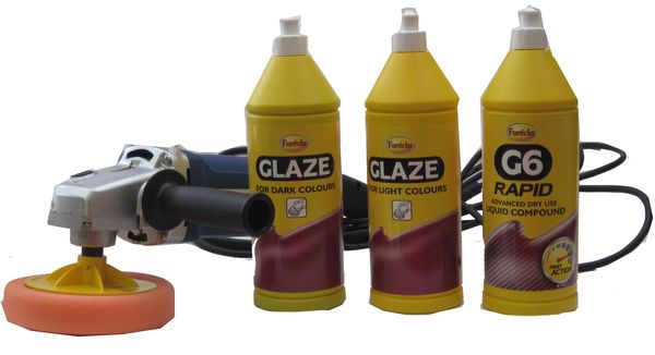 1 bouteille de G6 (flacon de 1l) : liquide à polir à sec - s'utilise à sec pour tous les types de peintures modernes et permet d'éliminer en une seule application les marques d'abrasifs,